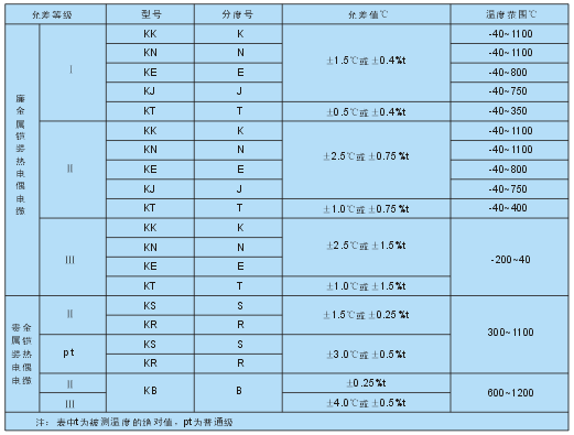 由不同型號的鎧裝熱電偶電纜制成的鎧裝熱電偶,當參考端為0℃時,熱電動勢應符合GB/T16839.1—1997《熱電偶第一部分:分度表》,不同等級的允差應符合表1—3規(guī)定。
