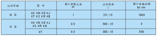 絕緣電阻應在偶絲與偶絲之間和偶絲與外套管之間測量。外直徑≤1.5mm的電纜,所用電壓為75±25Vd.c,外直徑>1.5mm的電纜,所用電壓為500±50Vd.c。室溫每米絕緣電阻和高溫每米絕緣電阻應符合表1—4的規(guī)定。
